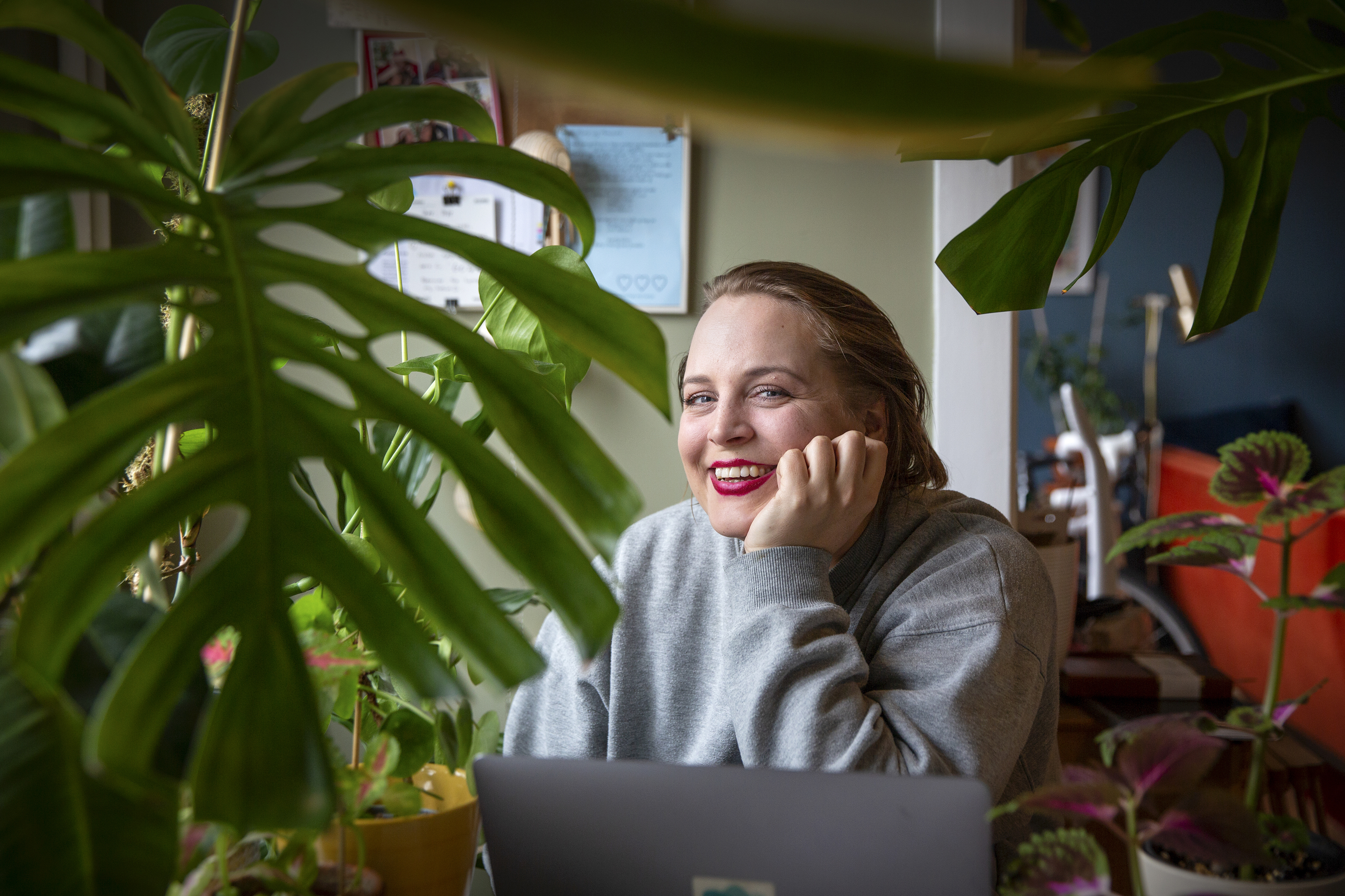 – Nå tar jeg hendene godt nedi jorda her. Det er faktisk bevist at det å grave i jord utløser lykkehormoner. Vi mennesker trekkes mot natur, sier Anniken Hoff Quirk, og demonstrerer for kursdeltakerne hvordan man potter om planter.