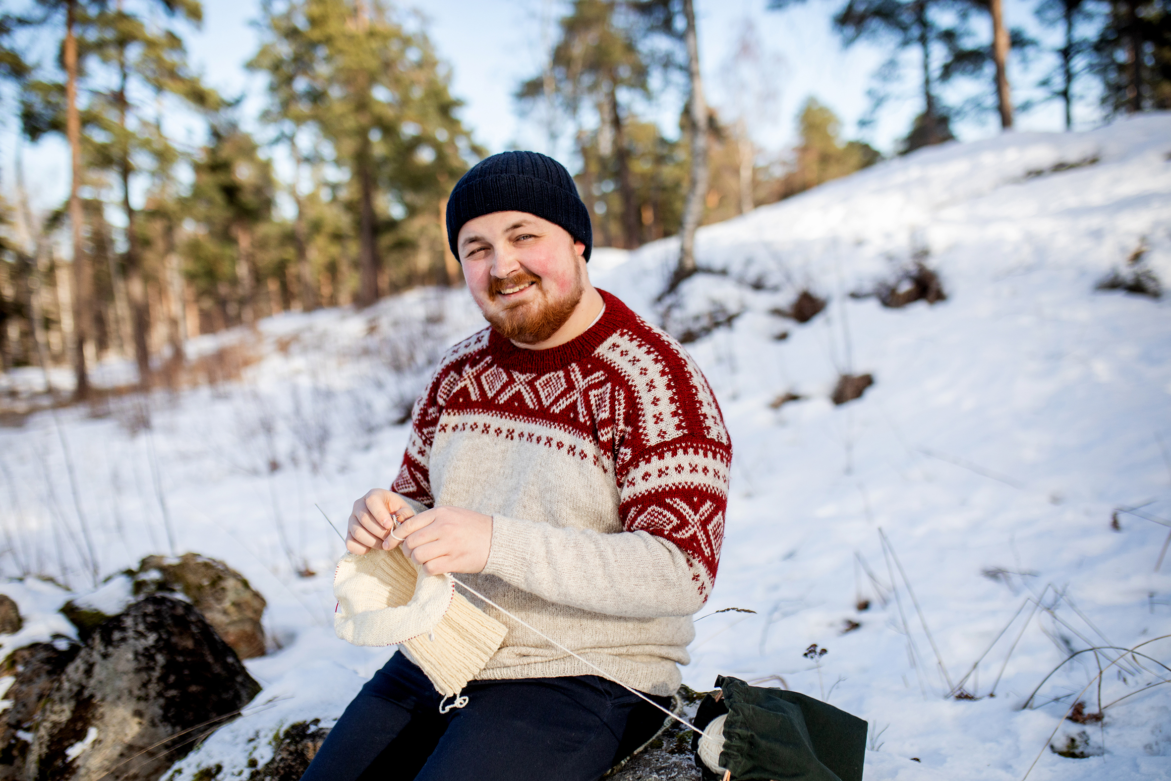 Jørgen Johnsen (25) er soldat i Frelsesarmeen og har strikket siden han var seks år. Denne vinteren har han invitert sine mange strikkeglade følgere på Instagram og Facebook til å hjelpe de som trenger litt ekstra varme på kalde dager.