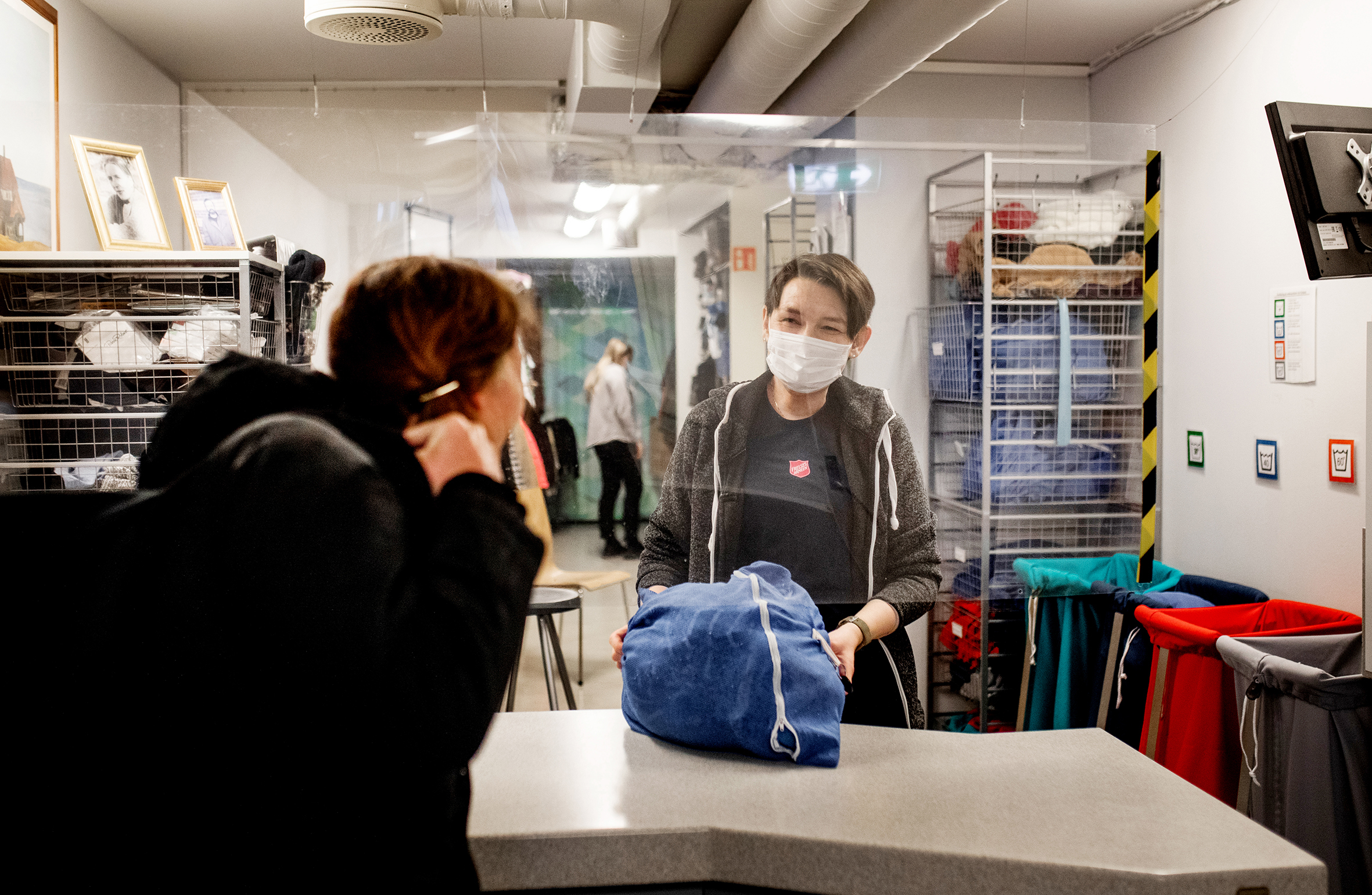 Folk på gata stimer til vaskeriet på Fyrlyset i Oslo. Etter at pandemien satte inn, trenger stadig flere en dusj, en ny ytterjakke eller få levert tøyet sitt til vask.